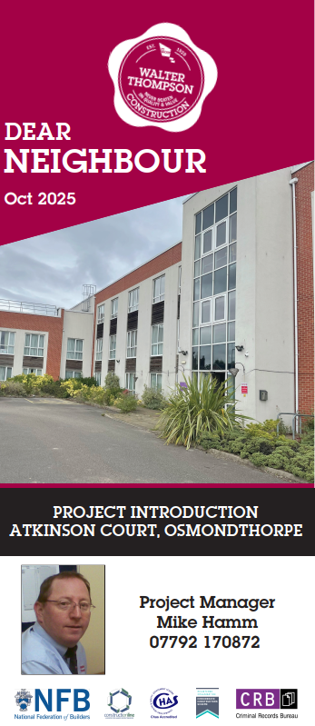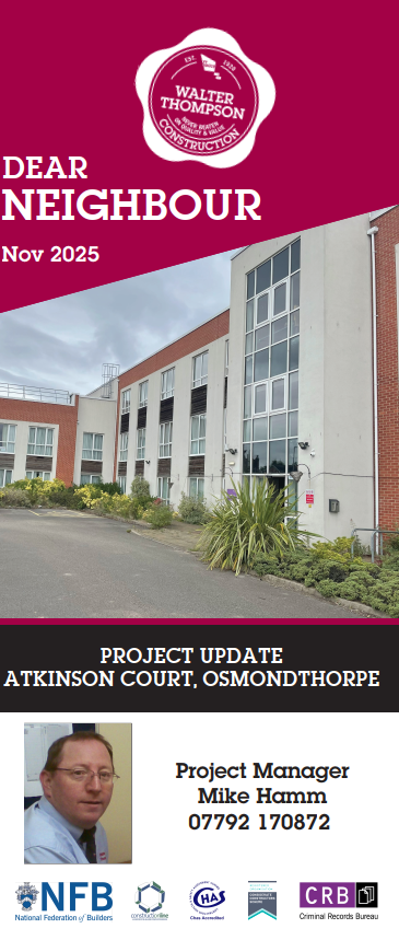 Walter Thompson (Contractors) Ltd are delighted to have been appointed as the Main Contractor by Fisher Care Group Ltd, to carry out the refurbishment of the existing care home on Ings Road. The care home will feature 78 bedrooms and has been carefully re-designed to alter the existing layout to provide high-quality Residential, Nursing and Dementia care, with the intention of becoming a valuable long-term addition to the community.