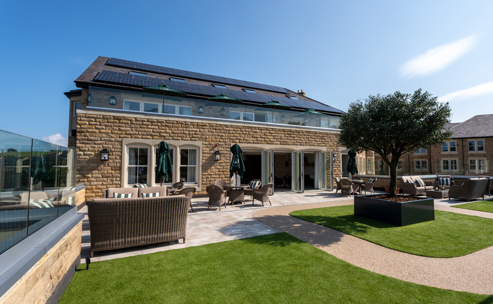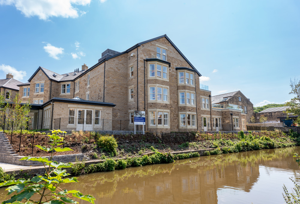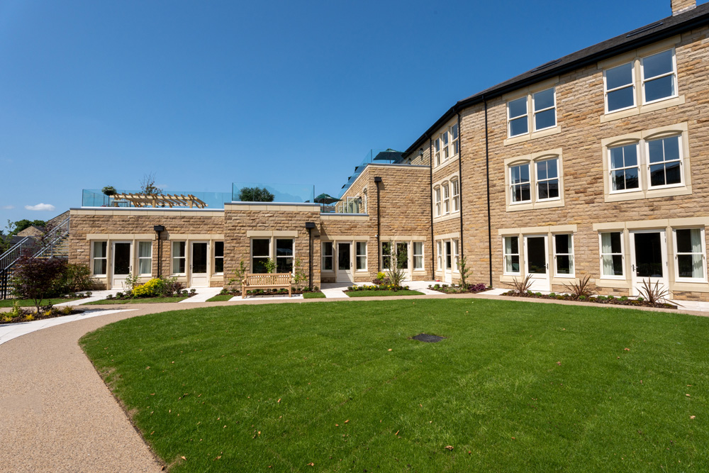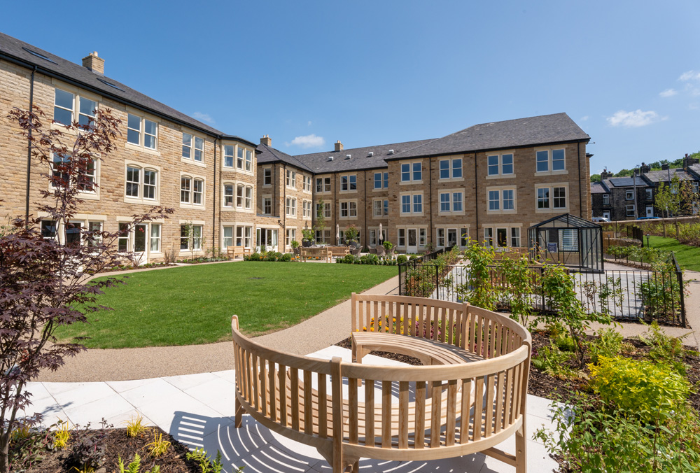 The external walling of the care home building is stone and is set over four storeys, the mill building brickwork has been retained which is set over three storeys incorporating a canalside café for residents and visitors. Externally we have created a large secure landscaped garden space which includes patio areas and a vegetable garden with a greenhouse.
