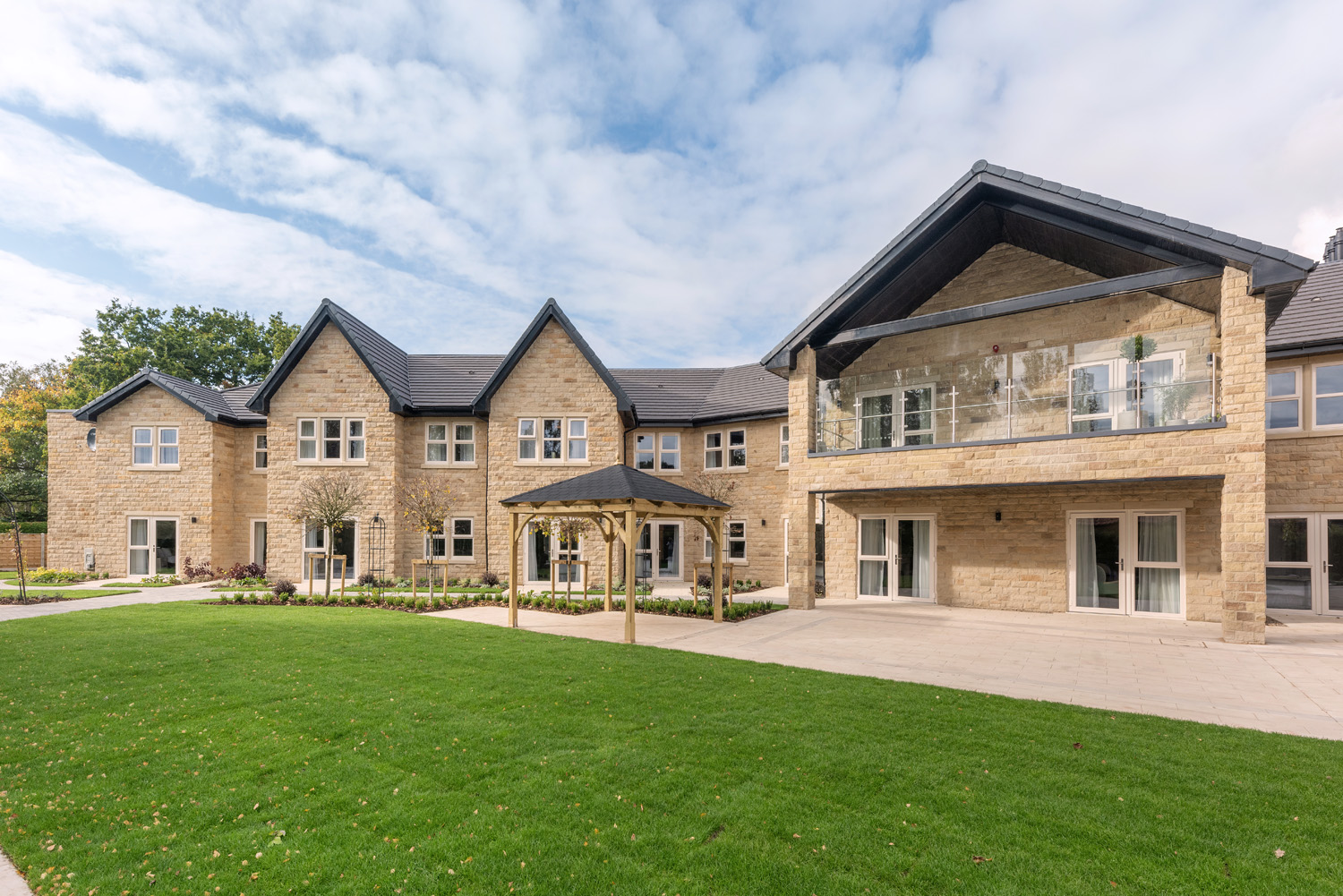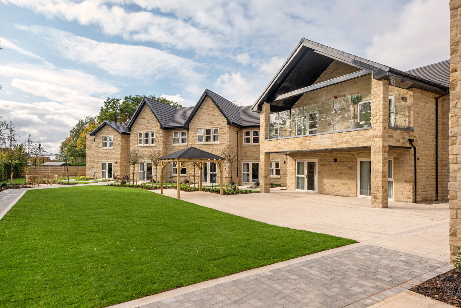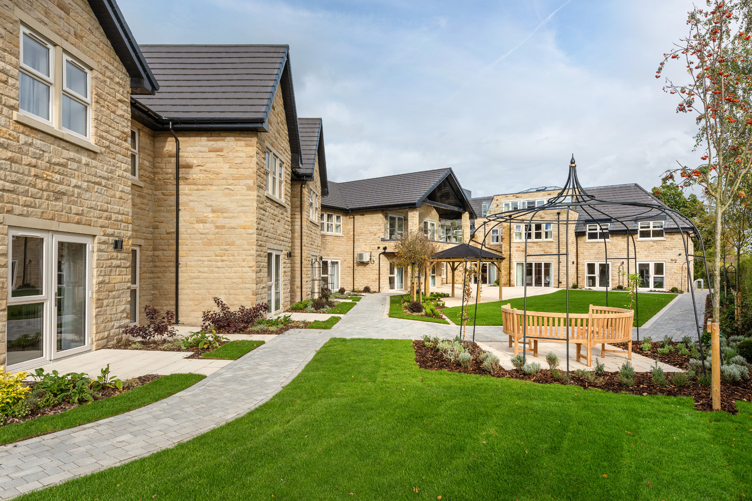 Goldsborough Manor was constructed on a brownfield site previously occupied by another care facility, which was demolished prior to development. The building is designed across three storeys, externally featuring natural stone. On the second storey you will find ‘Betty’s Bar’, named after the famous Yorkshire tearooms, and includes a terrace that looks out onto the secure landscaped garden, which has been dotted with ornamental furniture and paved patio areas for outdoor relaxation.